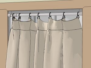 DIY Roman shades can be made with nothing but a few yards of fabric, hem tape, and tension rods. 3M Command hooks are another cheap, no-drill solution for curtains.